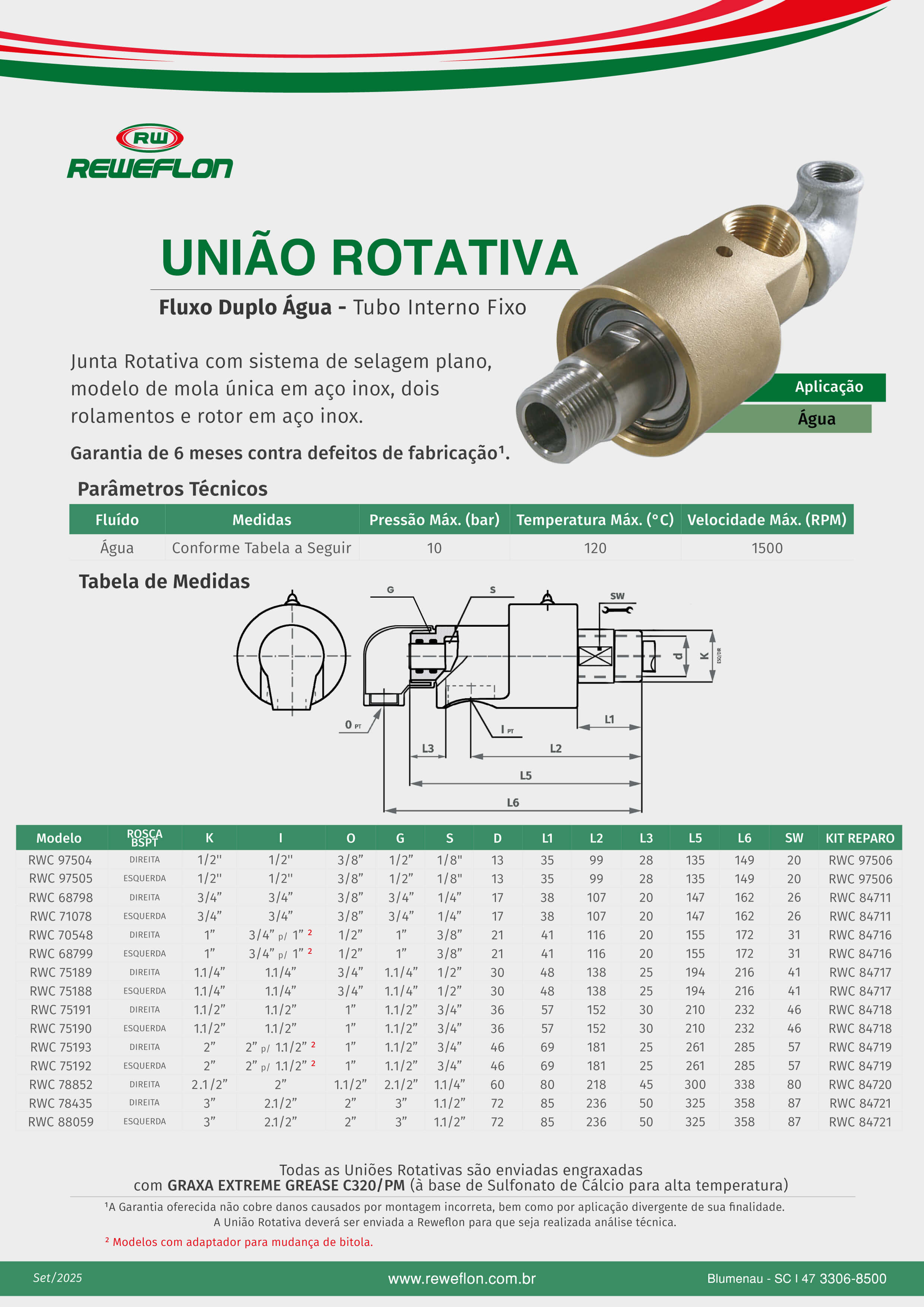 União rotativa com rolamento, fluxo duplo, entrada rosca BSPT esquerda ou direita, saída rosca BSPT.