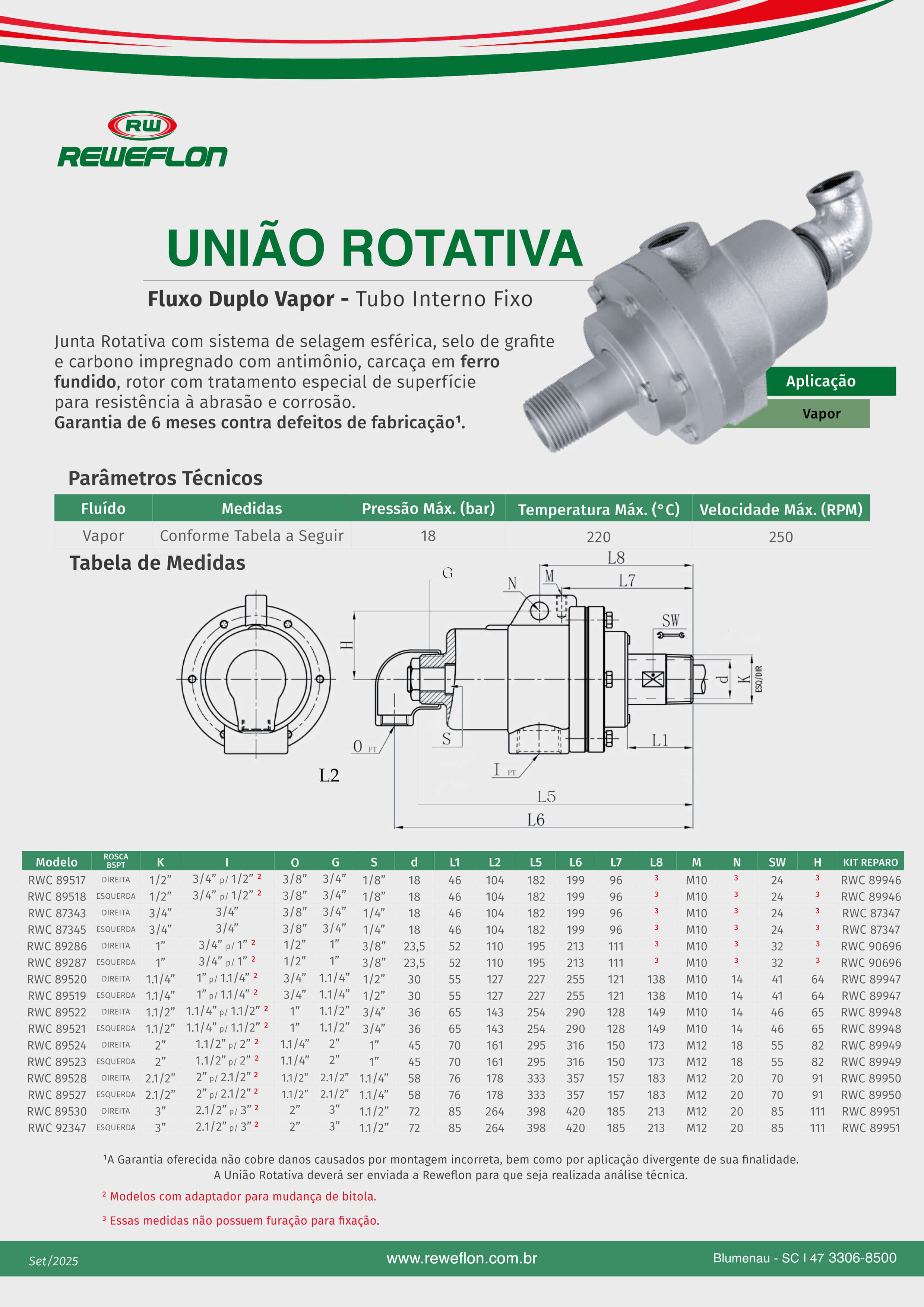 União rotativa sem rolamento, fluxo duplo, entrada rosca BSPT esquerda ou direita.